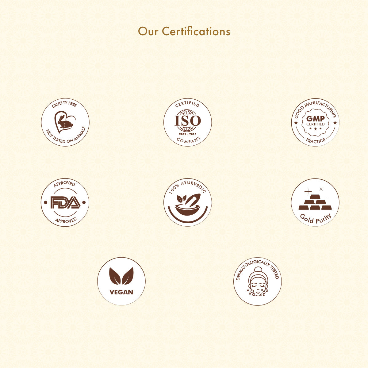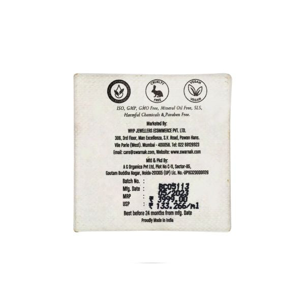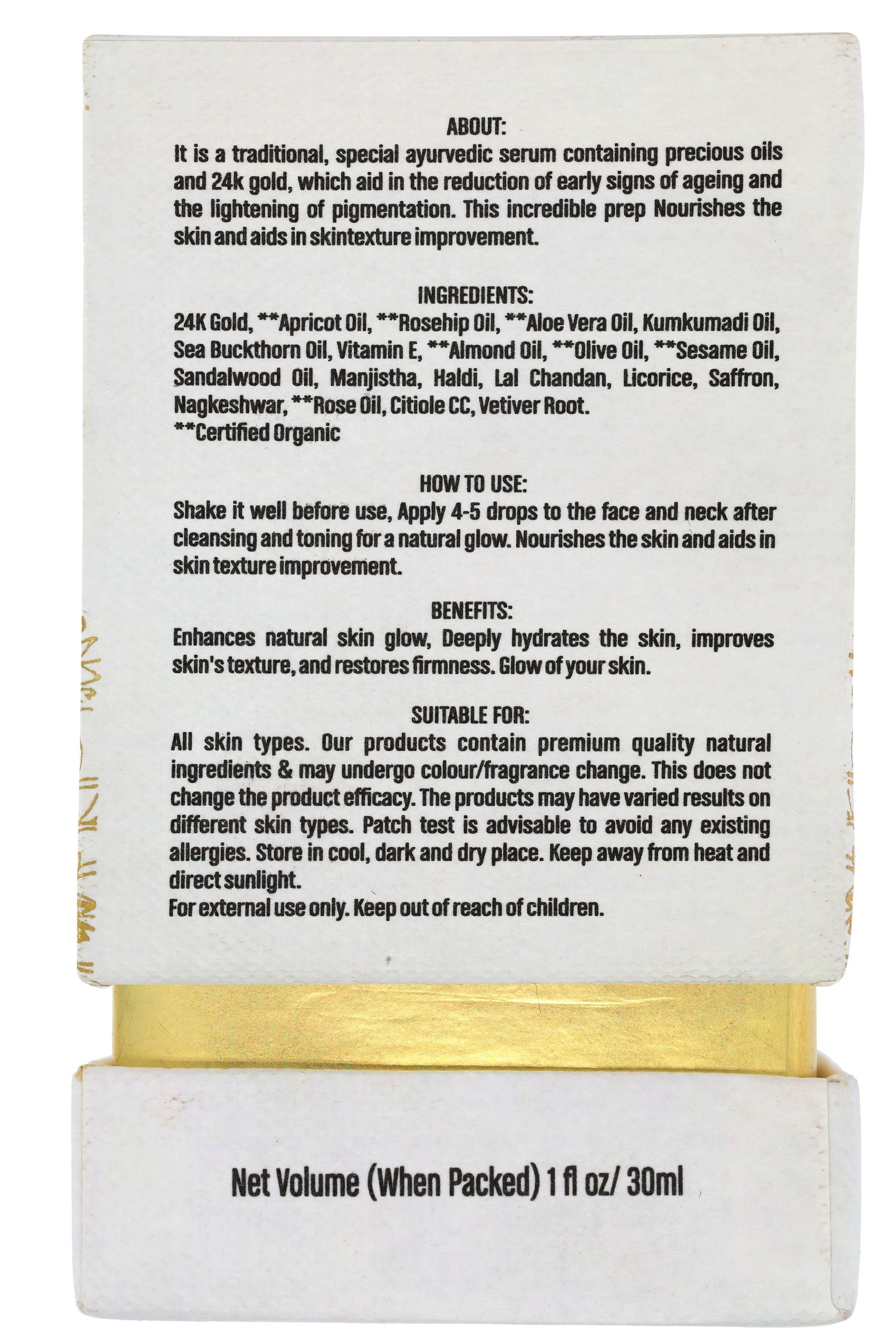 It has 99.99 purity gold, certified by FDA, its 100% Ayurvedic, Natural, Cruelty Free, Vegan, GMP, free from Harmful Chemicals, Parabens, Silicones, GMO, Mineral Oil and Petrochemicals. And manufactured in ISO 9001:2015, ISO 22000:2018, FDA & USDA organic certified complaint facility